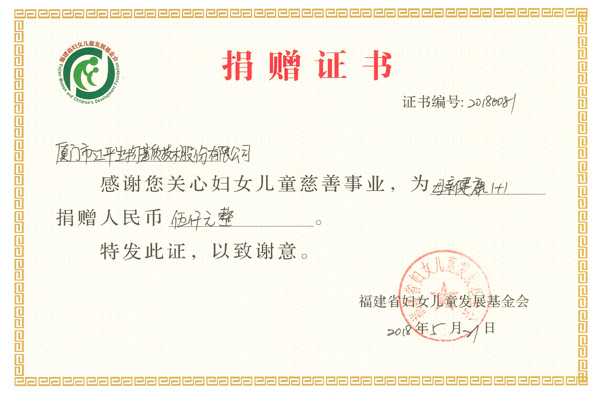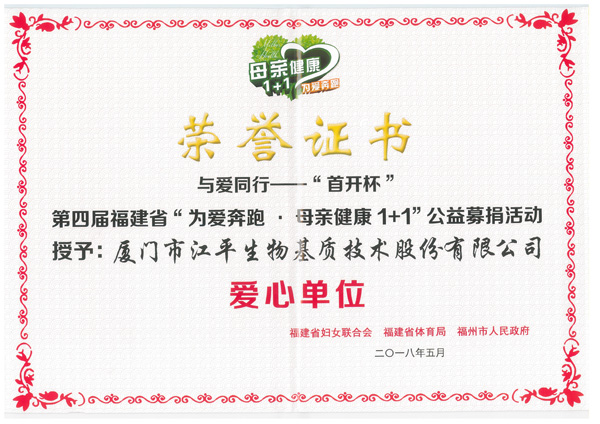 江平生物夏江平董事長不僅在工作上兢兢業(yè)業(yè),更是積極參與社會活動,在2018年2月被廈門市婦女聯(lián)合會評為“2016-2017年度三八紅旗手”。本次“為愛奔跑·母親健康1+1’”公益募捐活動中,她積極響應(yīng)福建省婦聯(lián)的號召,配合福建省婦聯(lián)的工作開展,以公司名義捐款,用實際行動,為“兩癌”貧困母親送去溫暖和希望,略盡綿薄之力。