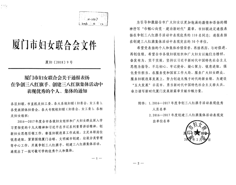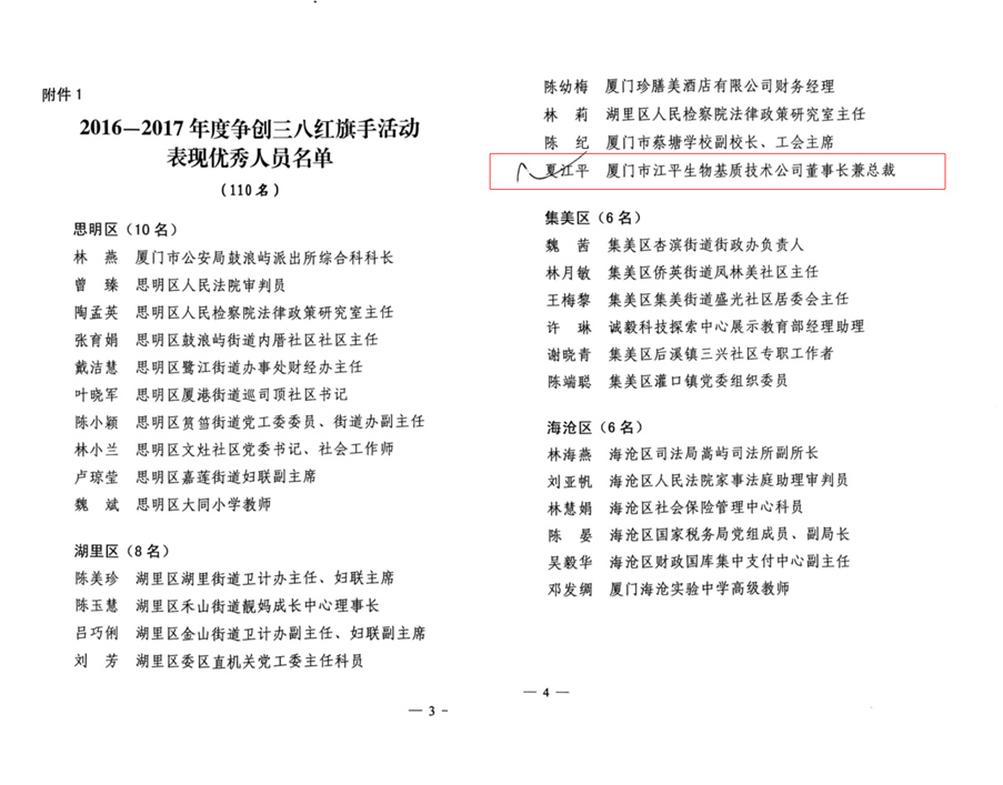 夏江平因其在“2017年金磚國家領(lǐng)導(dǎo)人廈門會(huì)晤”、文明城市創(chuàng)建、垃圾分類等工作中的突出表現(xiàn),被廈門市婦女聯(lián)合會(huì)評(píng)為“2016-2017年度爭創(chuàng)三八紅旗手活動(dòng)”優(yōu)秀個(gè)人,這份榮譽(yù)肯定了她為基質(zhì)行業(yè)和社會(huì)做出的巨大貢獻(xiàn)。同時(shí),也激勵(lì)著她再創(chuàng)佳績,堅(jiān)持以習(xí)近平新時(shí)代中國特色社會(huì)主義思想為指導(dǎo),不忘初心、牢記使命,凝心聚力、銳意進(jìn)取,強(qiáng)化責(zé)任擔(dān)當(dāng),為建設(shè)“五大發(fā)展”示范市,勇當(dāng)新時(shí)代中國特色社會(huì)主義排頭兵,譜寫廈門發(fā)展新篇章貢獻(xiàn)巾幗力量。