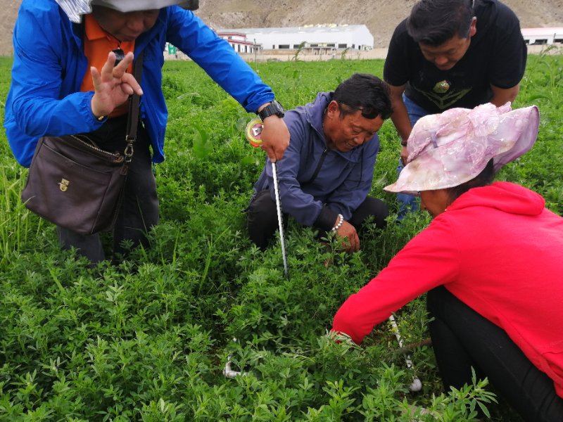 隨后,次仁云丹老師在紫花苜蓿種植現(xiàn)場,就第一期收割后復蘇管理、濕草翻曬、儲藏等問題,與西藏江平公司技術人員進行溝通交流,并提出了許多寶貴意見。