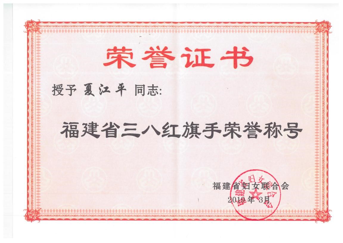 2019年3月廈門市江平生物基質(zhì)技術(shù)股份有限公司董事長夏江平女士,在福建省婦女聯(lián)合會評選中獲得由其授予的“福建省三八紅旗手”榮譽(yù)稱號。