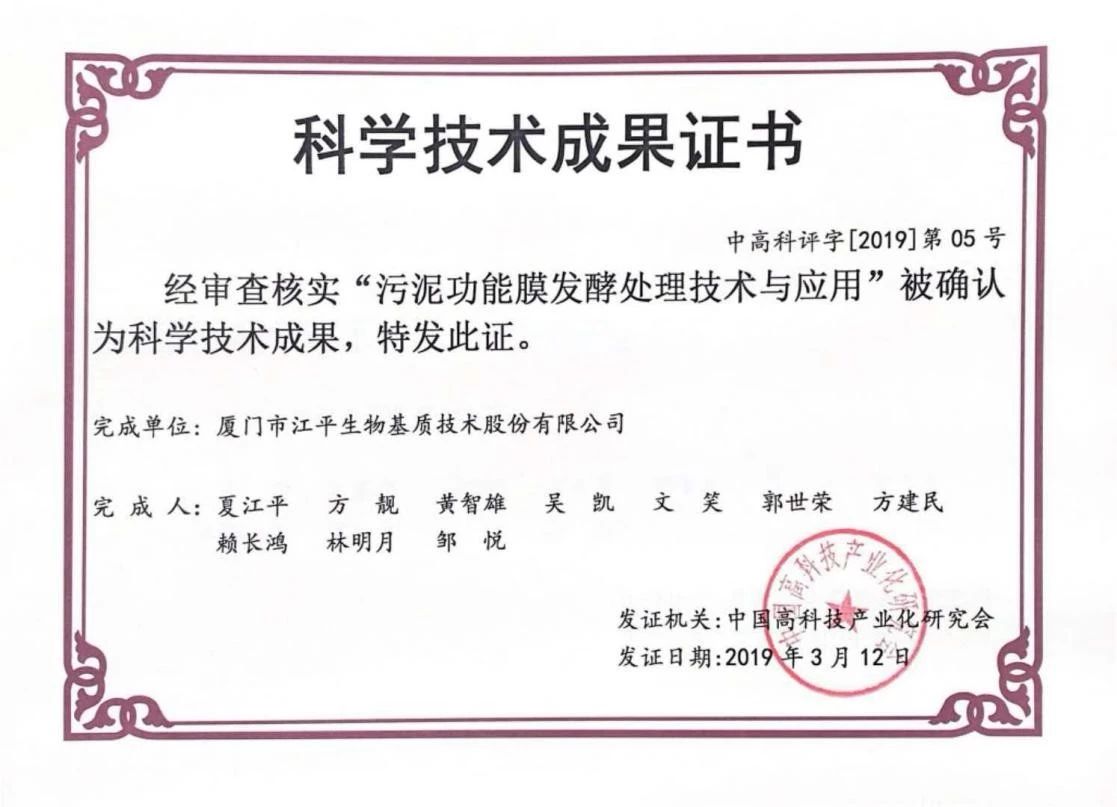 近期,我司的科研項(xiàng)目——“污泥功能膜發(fā)酵處理技術(shù)與應(yīng)用”,被確認(rèn)為科學(xué)技術(shù)成果,由中國(guó)高科技產(chǎn)業(yè)化研究會(huì)頒發(fā)該證書。