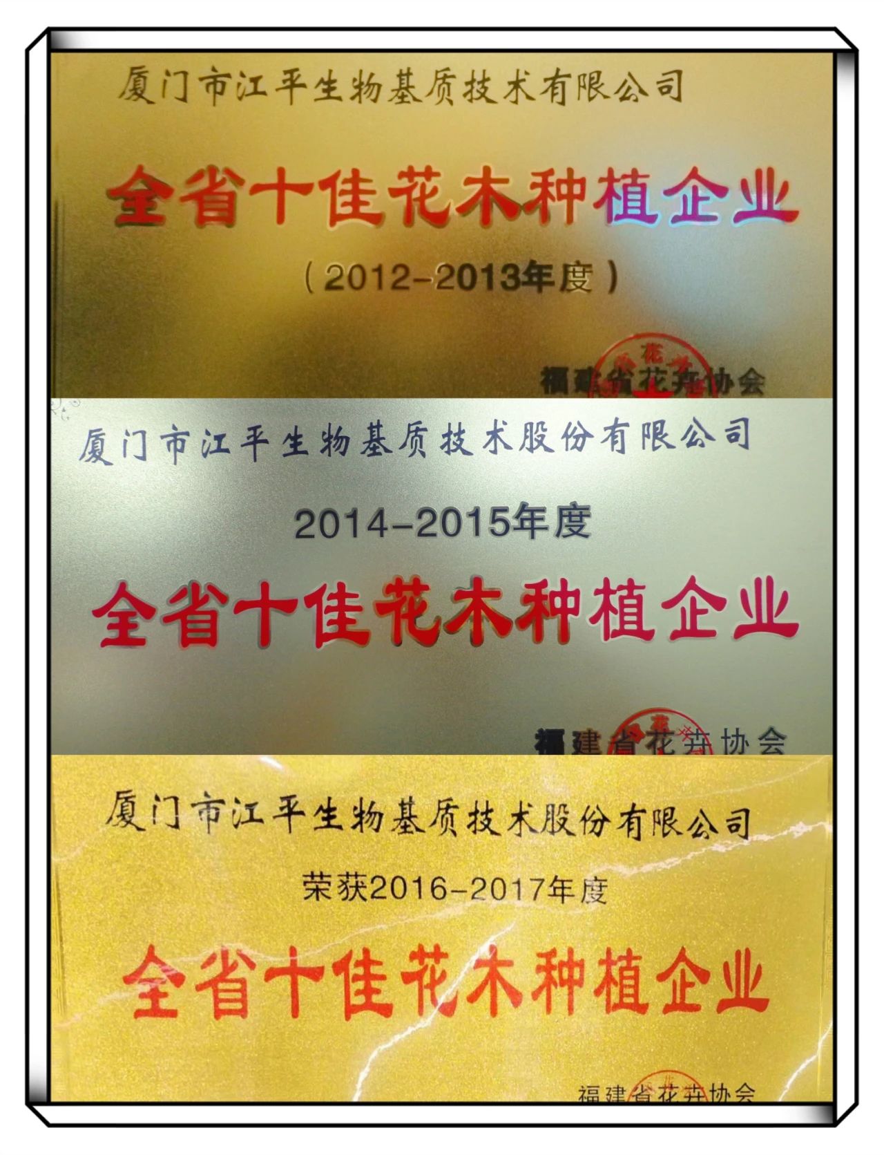 截止目前,江平生物已連續(xù)四次榮獲“全省十佳花木種植企業(yè)”,這標(biāo)志著公司在花卉產(chǎn)業(yè)相關(guān)建設(shè)的成績不斷受到行業(yè)的高度認(rèn)可。