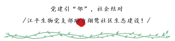 此次結(jié)對(duì)共建簽約儀式的成功舉辦,為社區(qū)與企業(yè)之間搭建了溝通橋梁,有效加強(qiáng)了社企黨建工作,促進(jìn)小區(qū)、企業(yè)黨支部之間的相互交流、相互促進(jìn),構(gòu)建基層黨組織互幫互助的工作機(jī)制。這也是江平生物黨支部的新嘗試、新探索、新作為,江平生物的黨員同志們定會(huì)把生態(tài)服務(wù)進(jìn)行到底,助力翔鷺的生態(tài)環(huán)境越來(lái)越美麗!