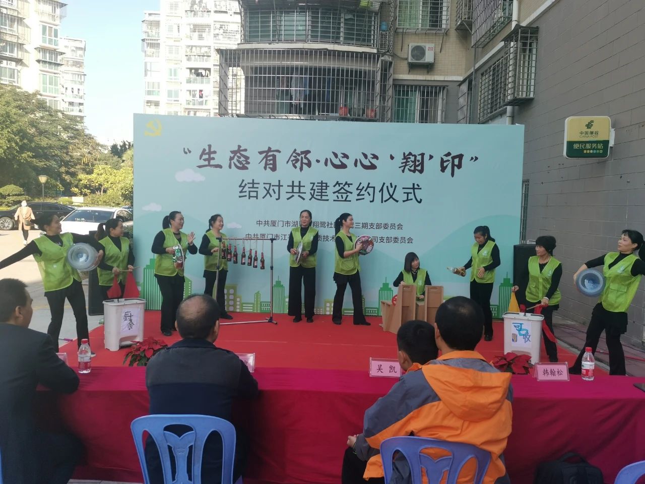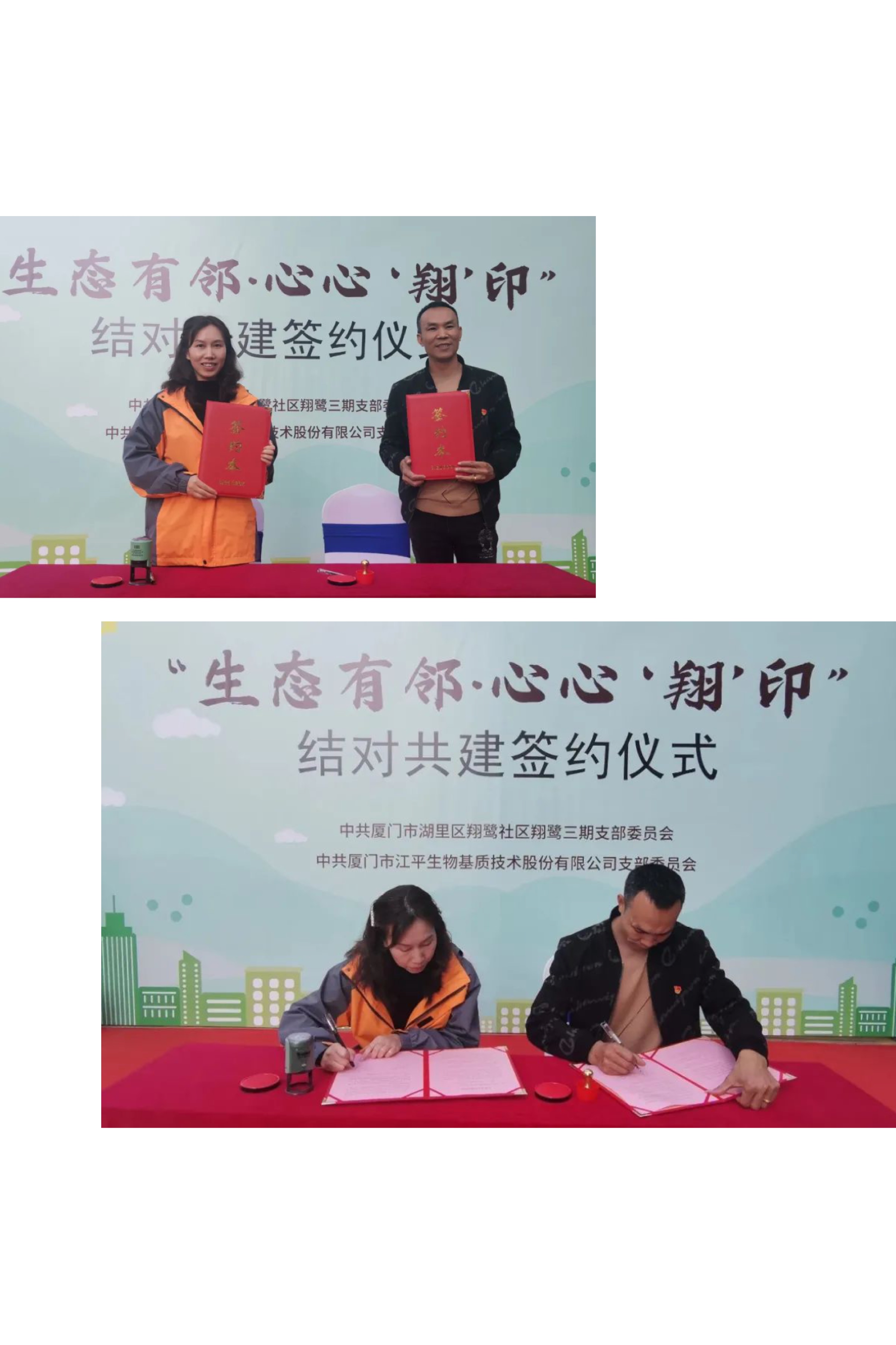 活動(dòng)現(xiàn)場(chǎng),在殿前街道辦事處主任助理王聲電、翔鷺社區(qū)黨總支書記洪永超等領(lǐng)導(dǎo)的見(jiàn)證下,江平生物黨支部同翔鷺三期黨支部莊重的簽下了社企結(jié)對(duì)共建協(xié)議書。