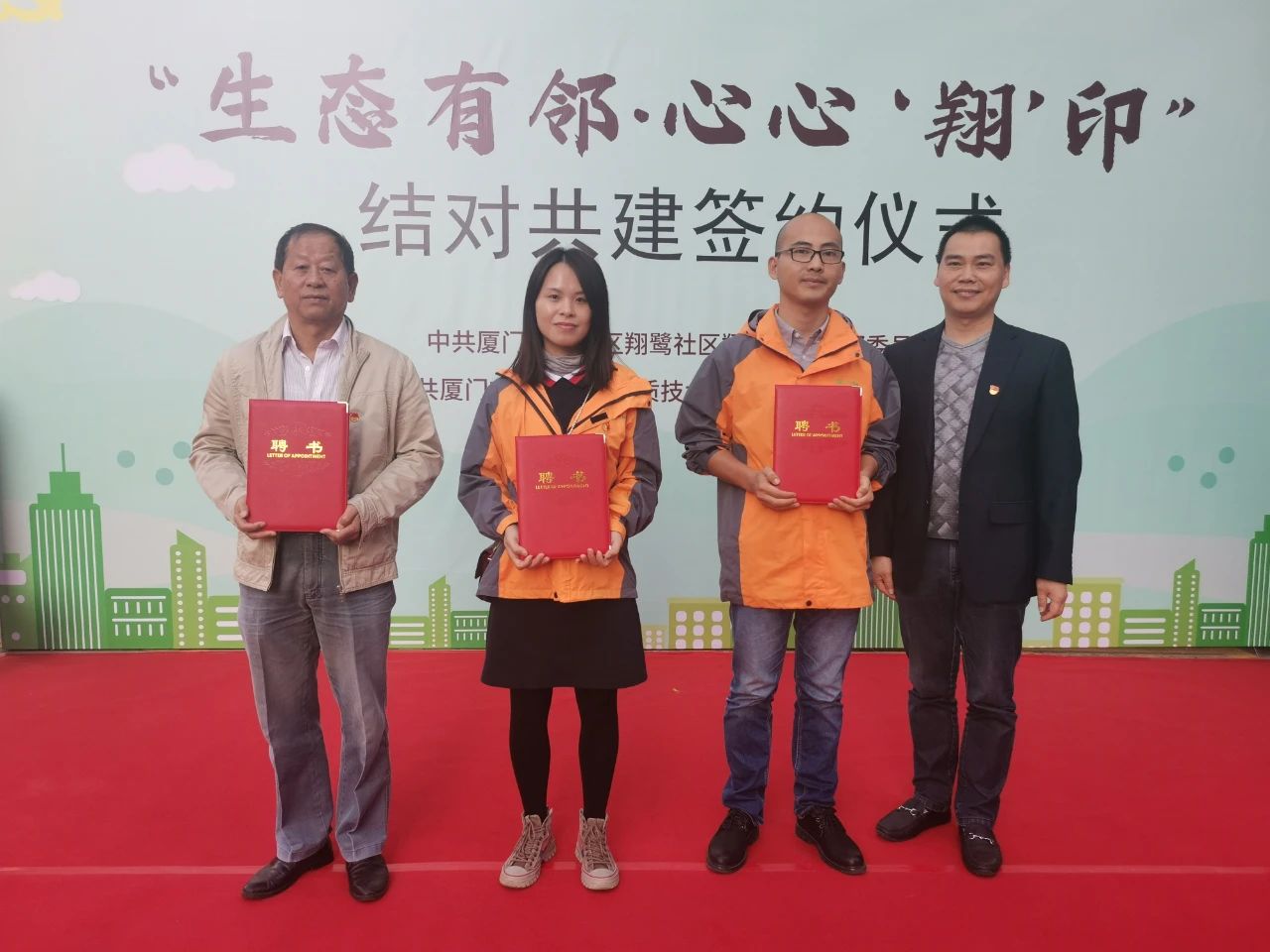 簽約儀式上,翔鷺社區(qū)黨總支書記洪永超為我司劉與明、林明月、韓翰松三位技術(shù)專家頒發(fā)聘書,聘任他們擔(dān)任翔鷺花城三期“生態(tài)先行官”,為翔鷺花城三期小區(qū)提供堆肥制作、物業(yè)日常綠化養(yǎng)護(hù)等方面的業(yè)務(wù)指導(dǎo)及利用寒暑假期間為小區(qū)的孩子們開展現(xiàn)場(chǎng)科普教學(xué)等。