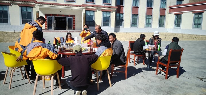 在忙碌的過(guò)程中,節(jié)日的氣氛也逐漸開(kāi)始濃厚。經(jīng)過(guò)了一上午的清掃后,大家圍在一起稍作休息,喝著藏式風(fēng)情的酥油茶。同時(shí),我們也不忘給奶牛場(chǎng)的臨時(shí)工作人員倒上一杯茶,讓他們也感受到了節(jié)日的溫暖。