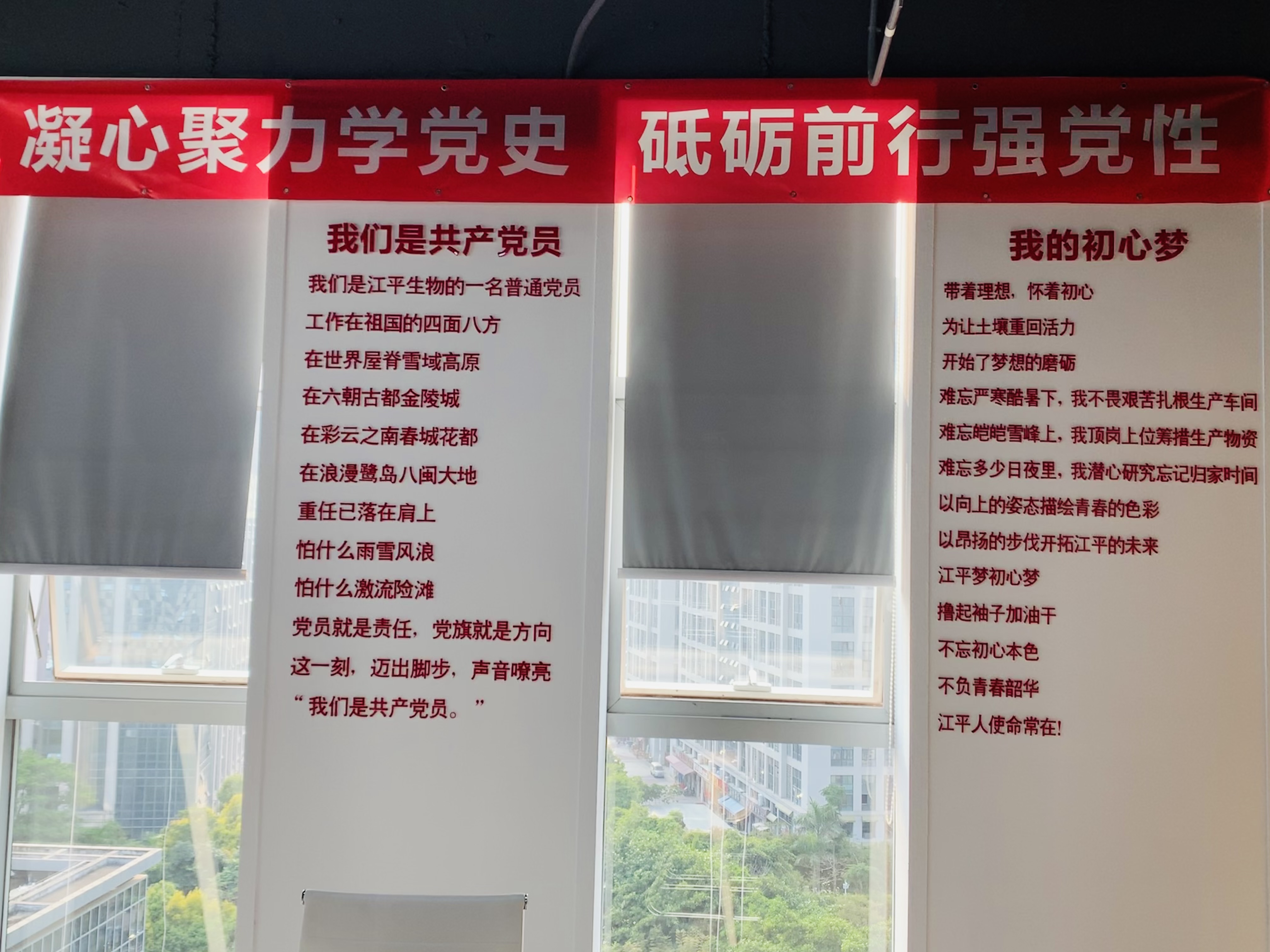 值得注意的是,位于江平生物黨建中心的植物黨徽墻吸引了眾多參觀者駐足,“這個(gè)是真正融入了企業(yè)本身的特色。”參觀者紛紛拿起手機(jī)拍下這特色的黨徽墻。最后走進(jìn)黨建室,映入眼簾的兩首江平生物自創(chuàng)小詩更是激勵(lì)了每一位江平人,也感動(dòng)了每一位參觀者,引得現(xiàn)場響起不斷的熱烈掌聲。