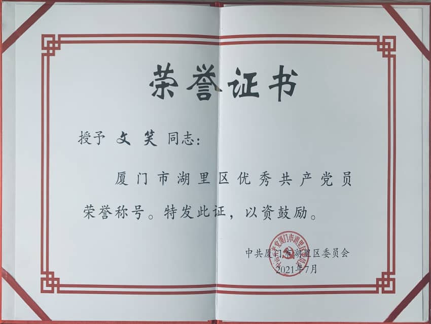 同日,全區(qū)“兩優(yōu)一先”表彰大會在湖里區(qū)行政中心東附樓三樓大禮堂召開,祝賀我司黨支部書記文笑榮獲“廈門市湖里區(qū)優(yōu)秀共產(chǎn)黨員”!