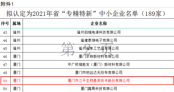 近日,福建省工業(yè)和信息化廳發(fā)布2021年福建省“專精特新”中小企業(yè)公示名單,全省共有189家企業(yè)入圍,廈門市江平生物基質(zhì)技術(shù)股份有限公司喜上榜單!