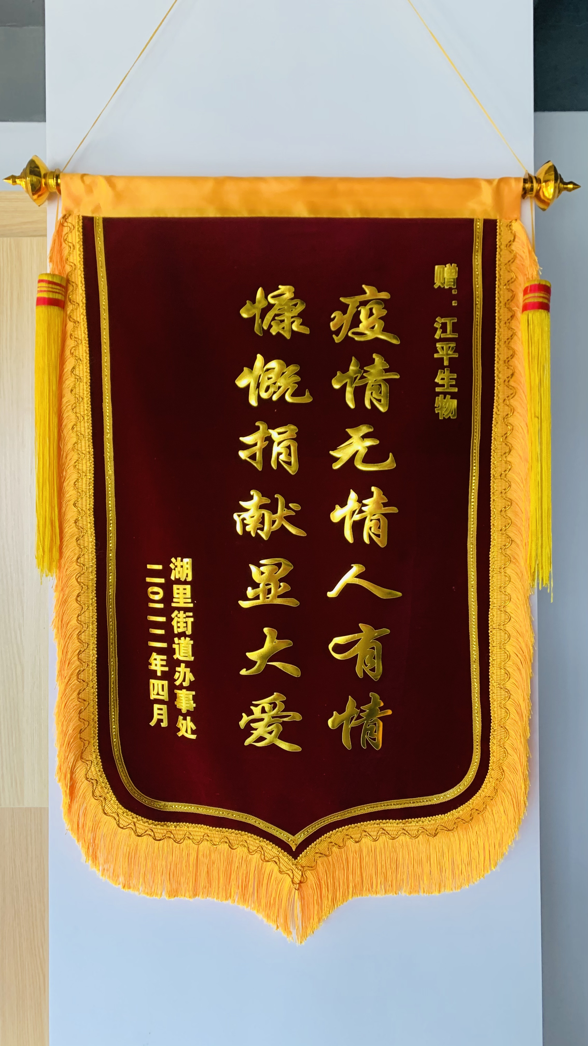 “疫情無(wú)情人有情,慷慨捐獻(xiàn)顯大愛(ài)”。近日,后鋪社區(qū)為江平生物送上了一面錦旗,錦旗上的這兩句話,凝聚了對(duì)我司在疫情期間愛(ài)心捐贈(zèng)行為的感謝之情。江平生物副總裁吳凱同志帶領(lǐng)公司黨員到后埔社區(qū)現(xiàn)場(chǎng)接收了這一份肯定。