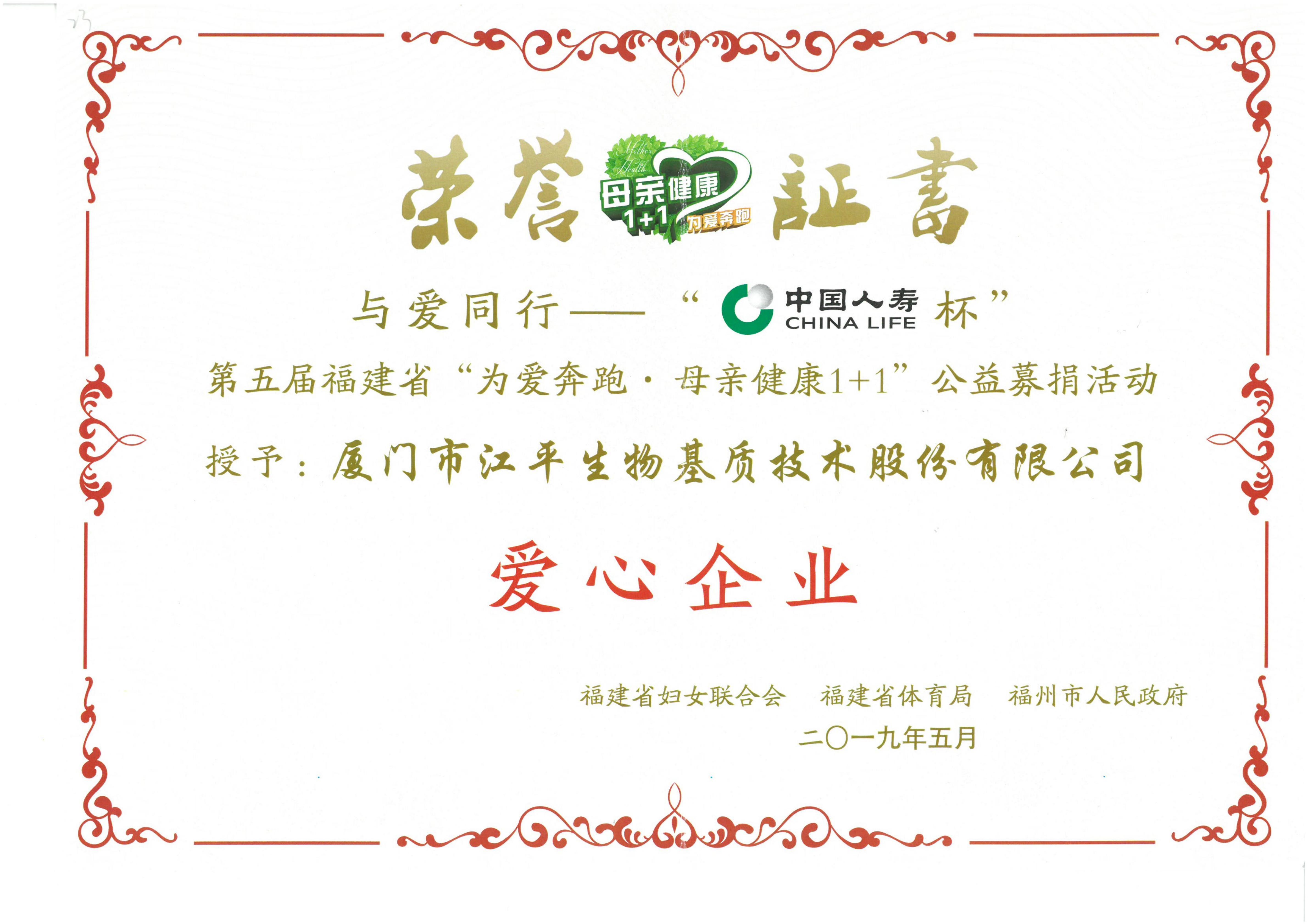 2019年5月12日,第五屆福建省“為愛奔跑?母親健康1+1”公益募捐活動(dòng)于福州海峽文化藝術(shù)中心舉行,廈門市江平生物基質(zhì)技術(shù)股份有限公司總裁夏江平女士作為福建省女企業(yè)家一員帶領(lǐng)江平生物公司數(shù)位員工為愛而跑,并捧回了“愛心企業(yè)”榮譽(yù)證書。